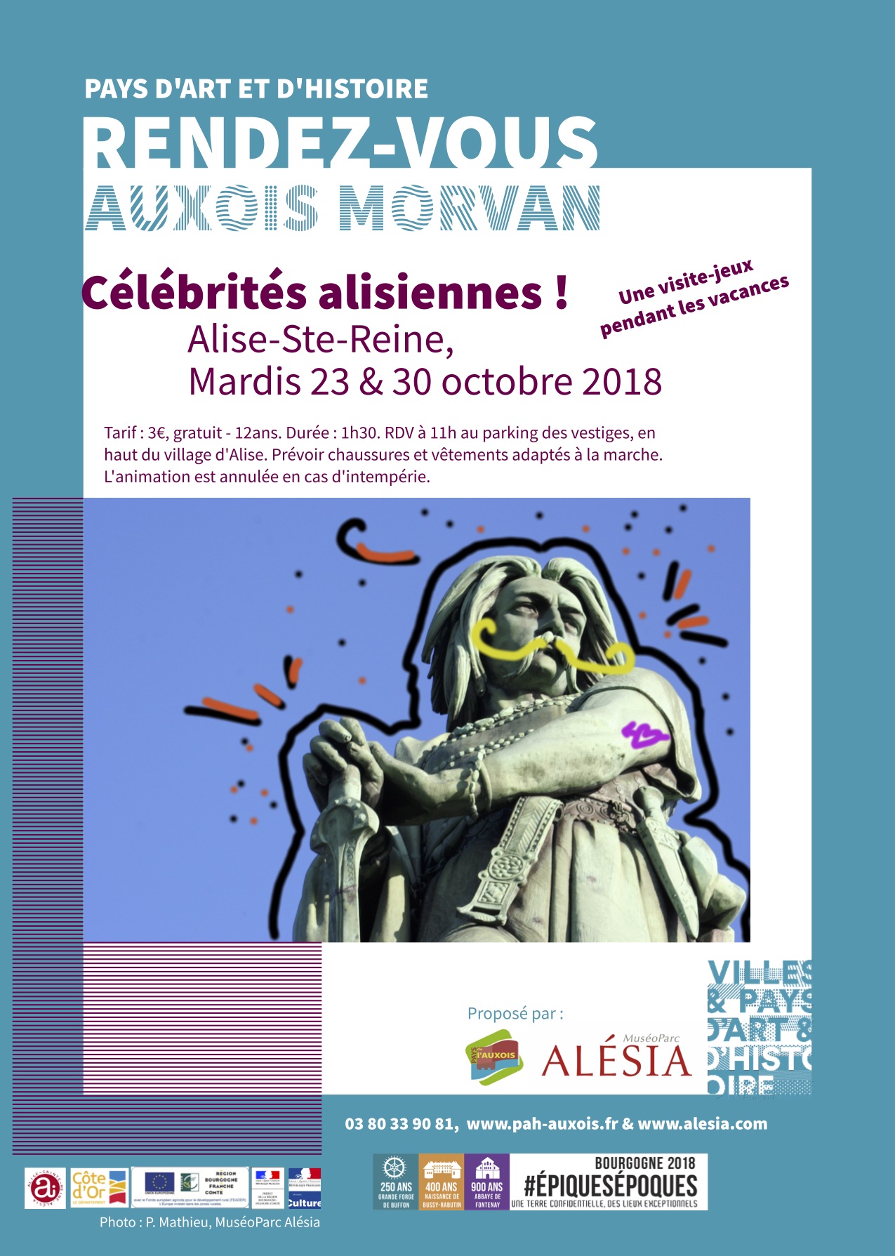 MARDIS 23 & 30 OCTOBRE partez à la rencontre des personnages d’Alise-Sainte-Reine, en compagnie d’un guide et d’un livret-jeux, qui vont vous mener dans de folles aventures… Rdv à 11h au parking des vestiges gallo-romains, en haut du village. En partenariat avec le MuséoParc Alésia. VISITE DU 30 OCTOBRE ANNULÉE POUR CAUSE D’INTEMPÉRIES !